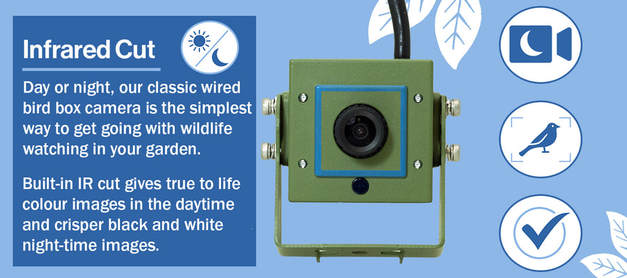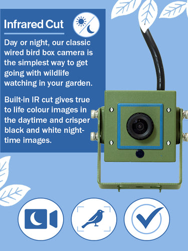Day or night, our classic wired bird box camera is the simplest way to get going with wildlife watching in your garden. It now has an improved IR filter complete with infrared cut. In other words, you’ll see top quality, true-to-life colour images.