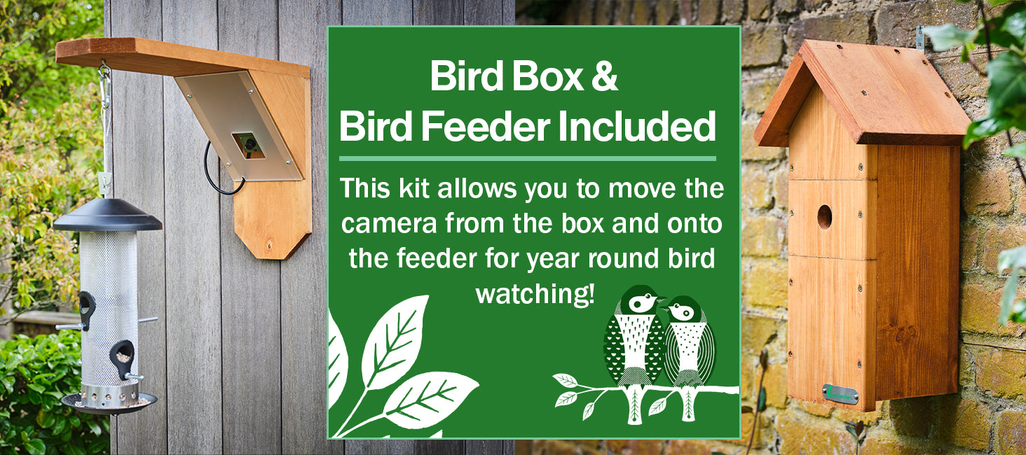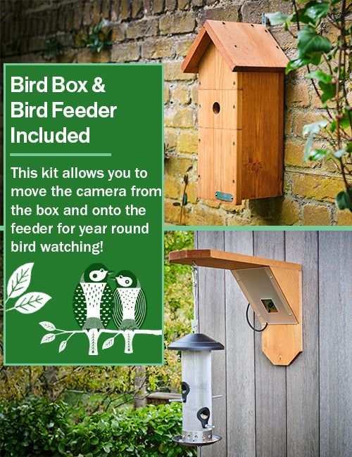 Our complete bird based garden camera kit. With our alpine Bird Box, Bird Feeder and WiFi Camera. This kit allows you to move the camera from the box and onto the feeder for year round bird watching!