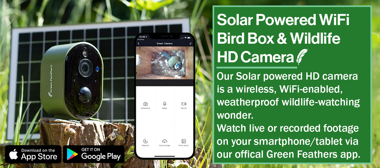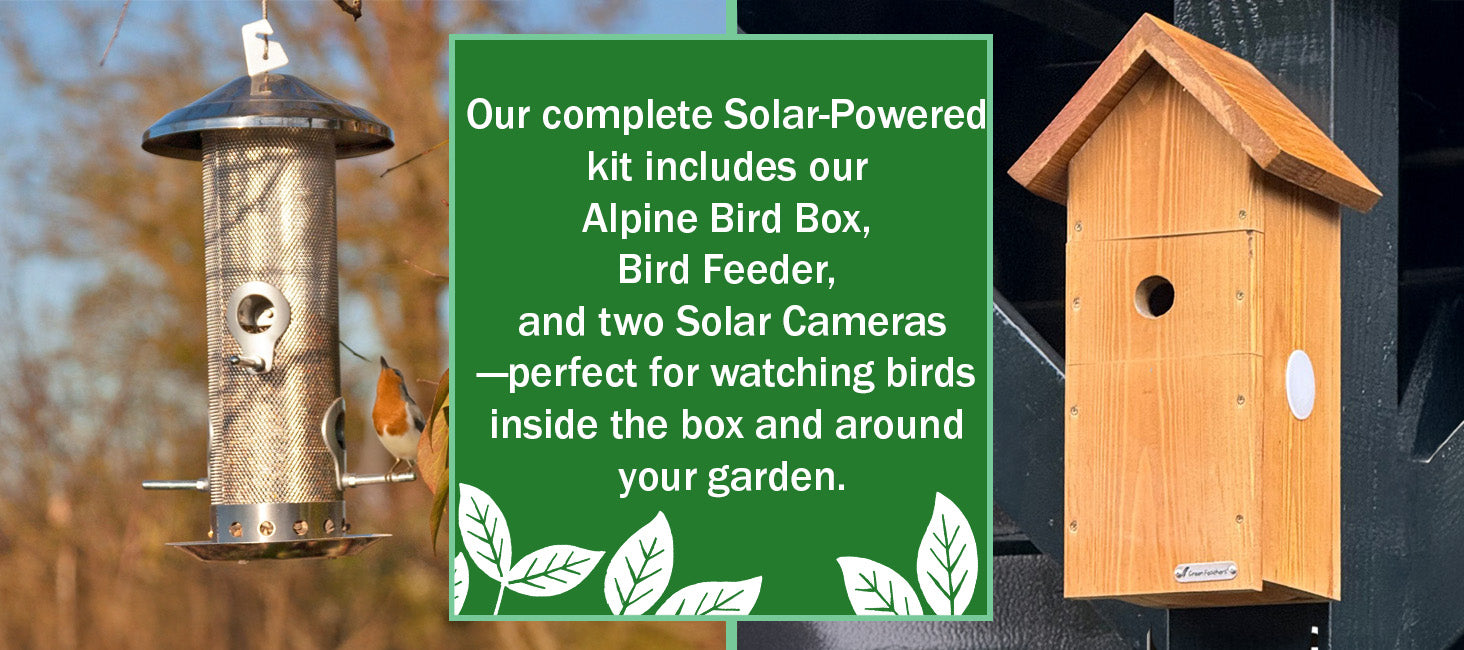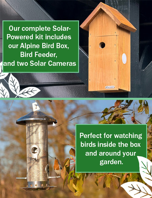 Our complete solar powered bird box and garden camera kit. With our alpine Bird Box, Bird Feeder and 2 Solar Powered Cameras. This kit gives you everything you need for inside and outside the bird box.