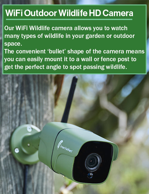 This third-generation WiFi wildlife camera allows you to watch many types of wildlife in your garden or outdoor space. The convenient 'bullet' shape of the camera means you can easily mount it to a wall or fence post to get the perfect angle to spot passing wildlife. Featuring built-in WiFi connectivity and night vision this camera can be connected to your WiFi network to allow you to connect to the camera wherever you are in the world! For recording, the camera features onboard storage for a microSD card to capture motion detection footage.