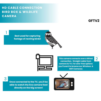 Our 1080p HD wired bird box camera with audio allows you to watch and hear everything from your bird box in the garden. When used with a cable and optional converter you can watch live images on your television from the comfort of your living room. This updated model is weatherproof unlike most of our other cameras. No focus option for this lens however. Includes a mini hd recorder for saving and playing back footage.