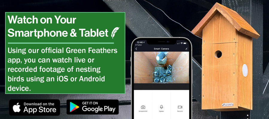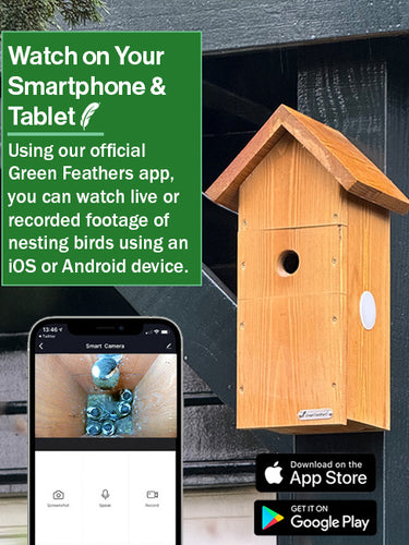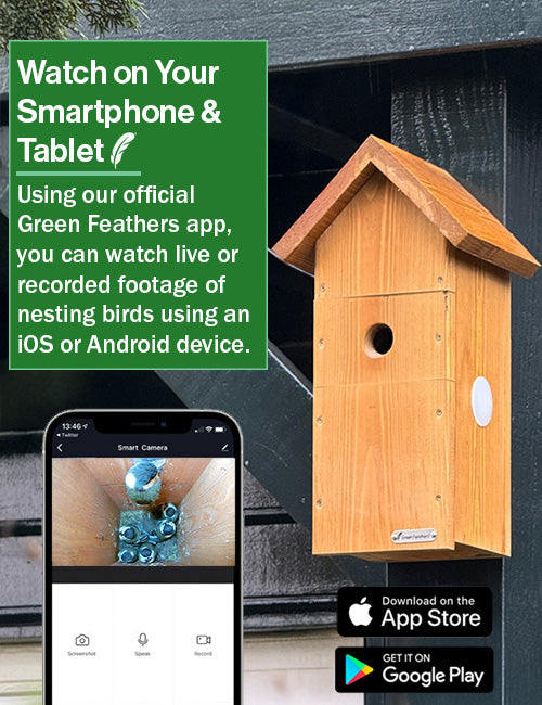 Our bird box camera with WiFi connection is our most popular camera for bringing nature indoors. Using the Green Feathers official app you can watch nesting birds anywhere in HD.