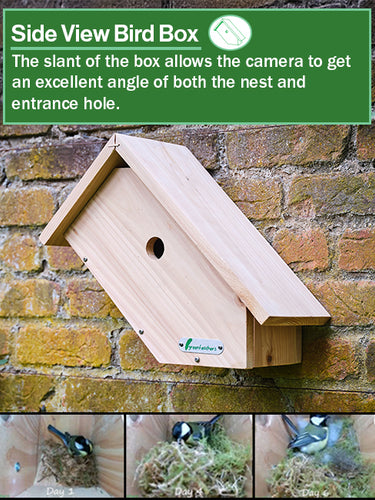 Speaking of bird boxes, the handmade wooden side view one included is brilliant for mounting your camera. It’ll give you the perfect angle to watch the entire nest area and entrance hole in 1080p HD, so you’ll see all the action. (The camera’s small and unobtrusive, so the birds won’t give you the side-eye when they take up residence.)