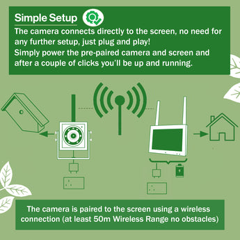 The camera is paired to the screen using a wireless connection (at least 50m Wireless Range no obstacles), meaning there is absolutely no need to worry about the signal strength of your Wi-Fi router where your birdbox is located (unlike other models). The camera itself is true HD giving you a 1080p picture and with our built in day and night-time LED lamps, you will get the best images possible. N.B if watching nocturnal wildlife, our daytime lamps can be turned off using the handy cap that covers the daytime sensor.