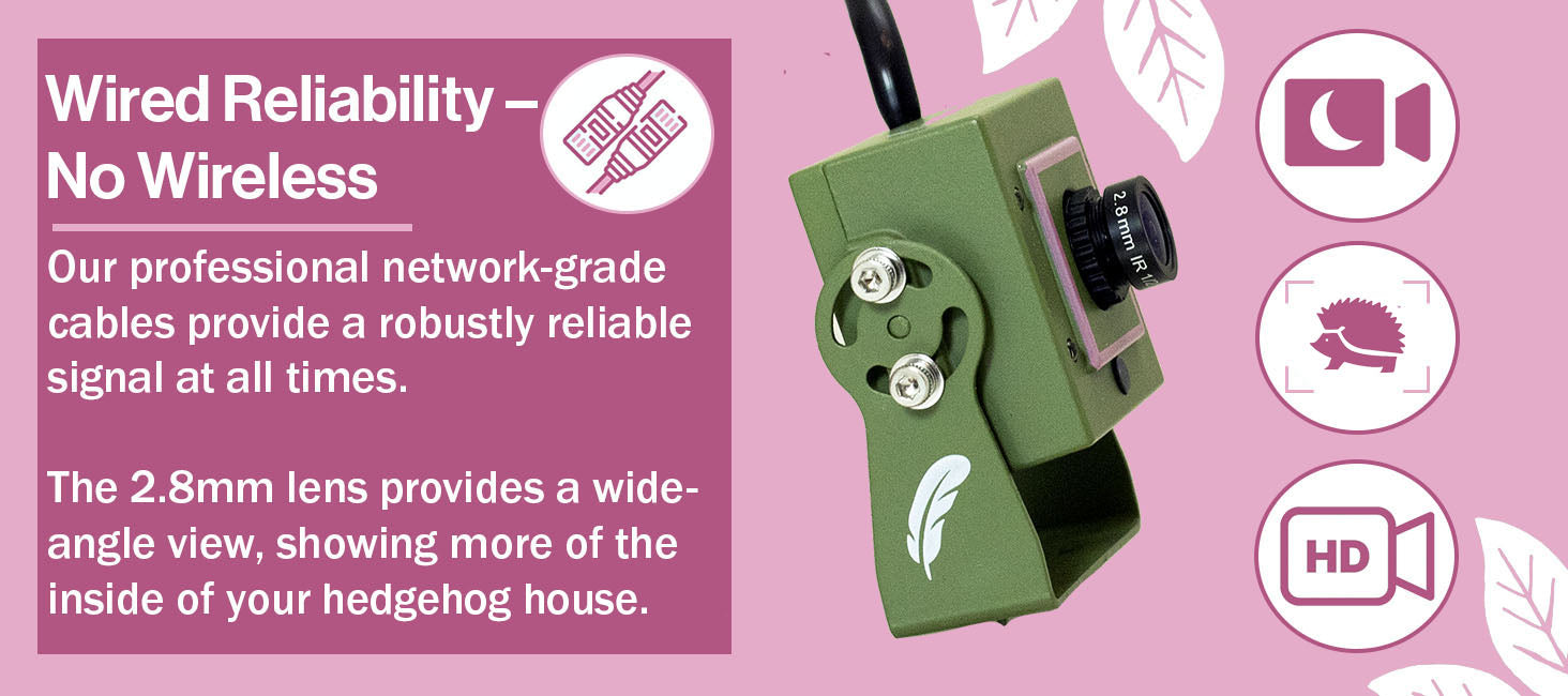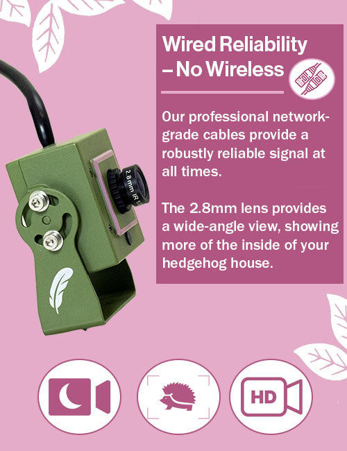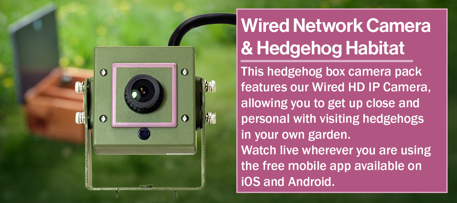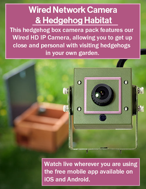 This hedgehog box camera pack features our wired HD IP camera, allowing you to get up close and personal with visiting hedgehogs in your own garden. This kit includes everything you need to get started: our HD IP nest box camera kit, a 20-metre network cable for the camera and our quality hedgehog box of your choice. The camera kit is designed so that you can check in on your phone or tablet and you can also watch and record on your computer.