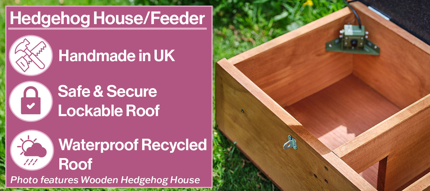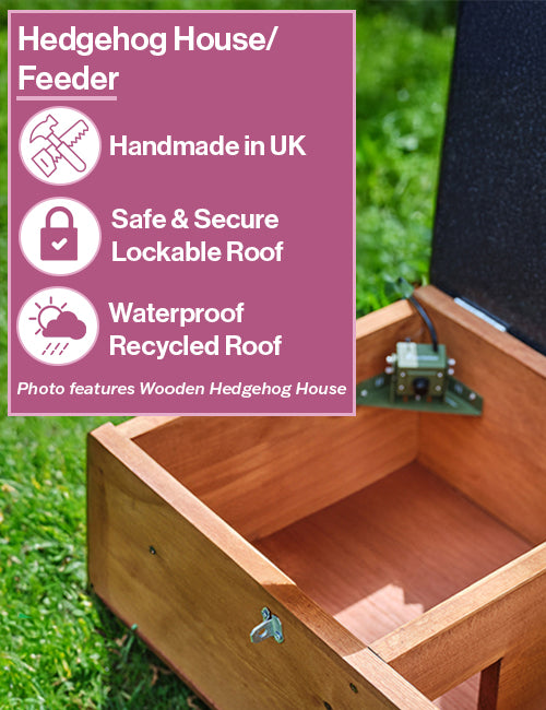Our hedgehog box features an eco-roof made of recycled composite materials with the added benefit of being completely waterproof and rot-proof. It's built with a sloping roof for water drainage along with additional grooves on the top of the side panels. The lid is hinged and lockable. Ventilation is provided by a clog-proof, narrow gap under the roof along the front.