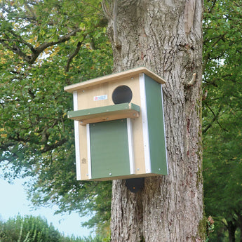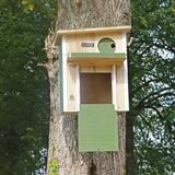 Built with sustainability and durability in mind, the side panels and fixing plates are made from FSC-certified Duraply and recycled farm waste. A spacious front platform and flat-topped roof offer ideal areas for landing, fledgling activity, and exercise.