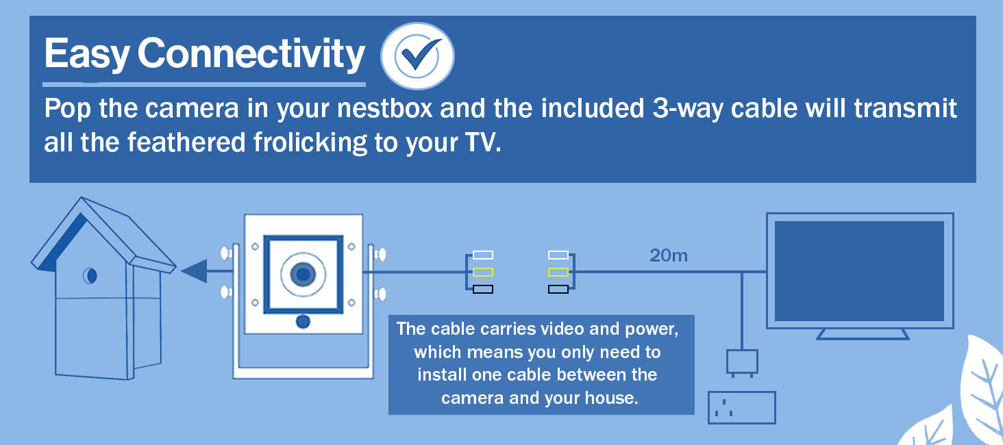 Our 1080p HD wired bird box camera with audio allows you to watch and hear everything from your bird box in the garden. When used with a cable and optional converter you can watch live images on your television from the comfort of your living room. This updated model is weatherproof unlike most of our other cameras. No focus option for this lens however.