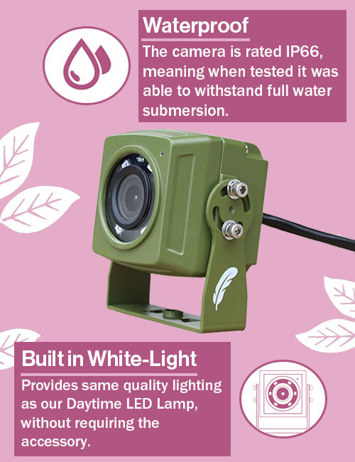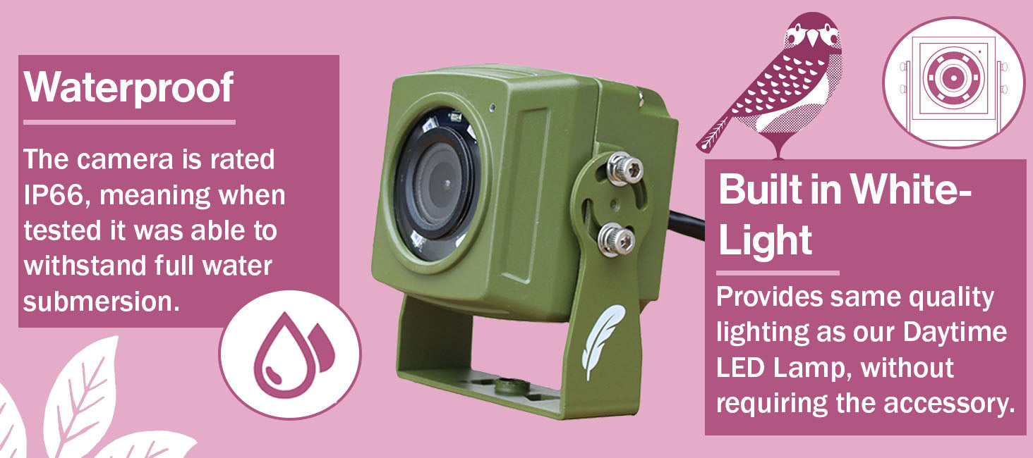 Our long range camera is a real first for those with big gardens who want to watch rarer birds further away from the house. The included transmitter’s achieved huge distances with a clear line of sight, but we ‘only’ claim 300m. (We can’t completely guarantee this if there’s not a clear line of sight between the transmitter and receiver, but it’s achievable for most people.)